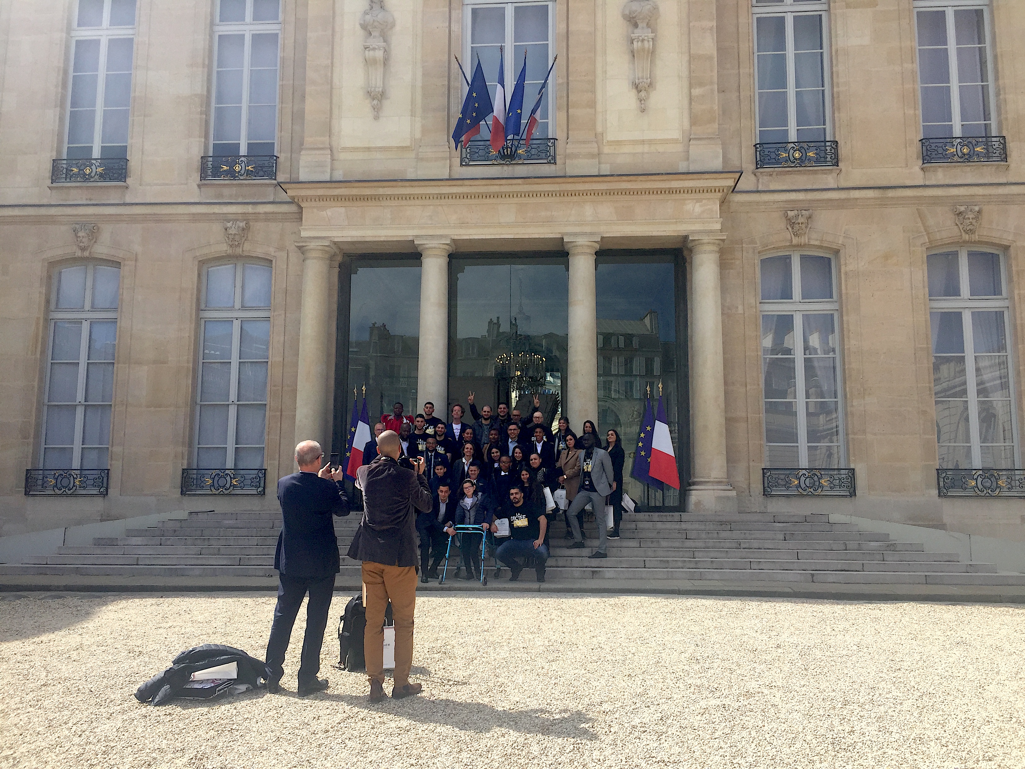 Brigitte Macron arrive finalement. Le texte de la dictée est tiré du roman Notre-Dame de Paris de Victor Hugo. Plus tard, c’est Emmanuel Macron qui passe pour faire quelques selfies et remettre les prix aux cinq gagnants : des stylos-plumes. Les autres repartent avec des goodies aux couleurs de l’Élysée. Avant de partir, Maïtena Biraben invite le père d’Abdellah Boudour à la rejoindre devant l’énorme blason doré siglé RF, pour République Française. Elle voudrait le prendre en photo aux côtés de son fils. Les deux hommes ont les larmes aux yeux, émus. Abdellah Boudour à l’assemblée :