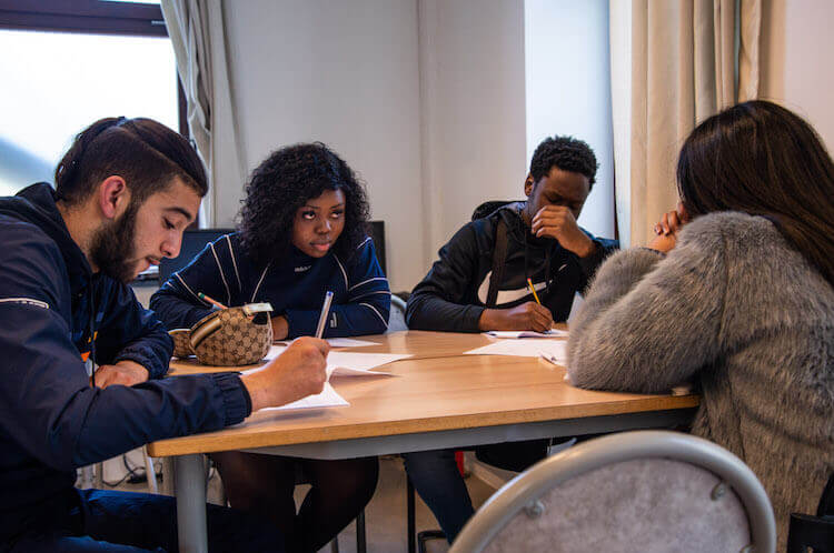 Ici, pas de salles de classe et d’élèves assis face au tableau. Seulement des blocs de tables et un formateur qui s’installe parmi eux. Les cours sont individualisés, avec des exercices adaptés au niveau de chacun. « On peut aussi, même si c’est plus rare, adapter l’emploi du temps en fonction des besoins de l’élève : lui mettre plus de cours de français par exemple… », détaille la directrice adjointe.
