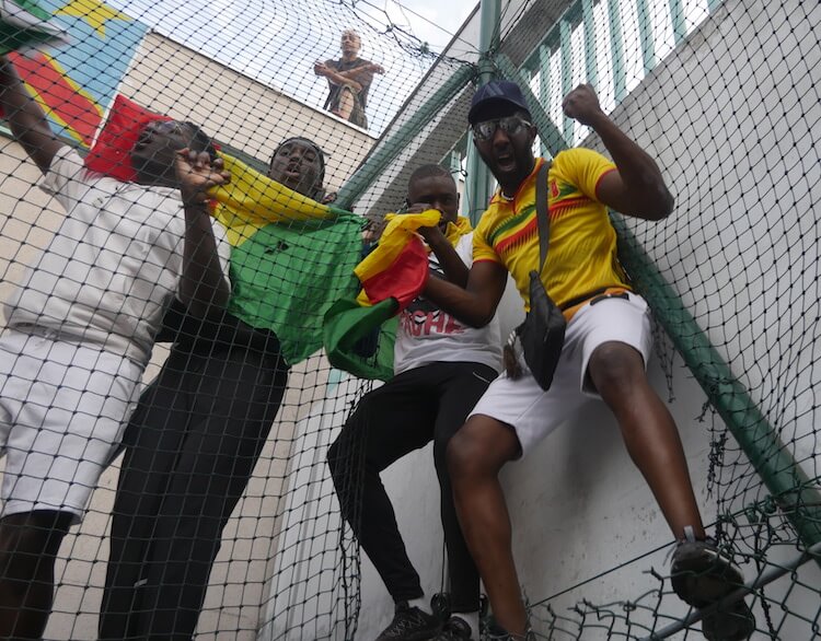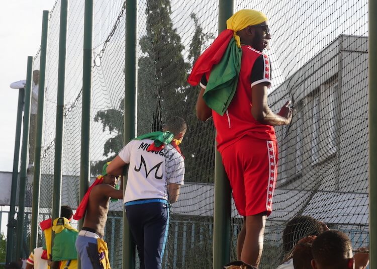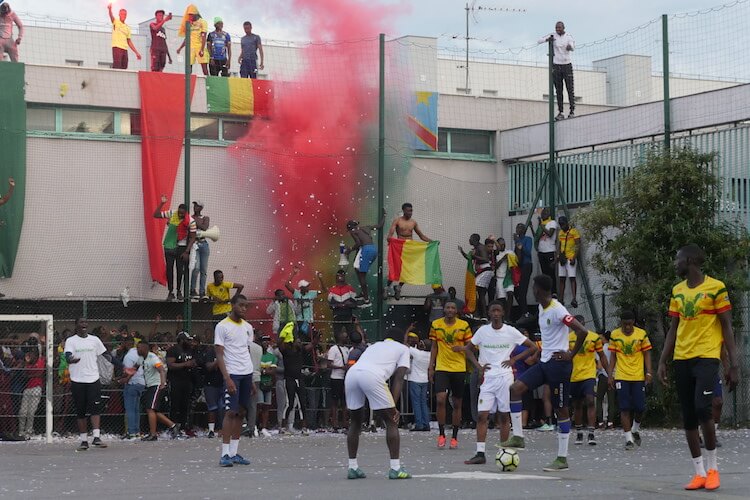 Les petits voulaient de l’engouement, ils l’ont eu : entre 300 et 400 personnes se sont pressées dans la ville du 93 pour un « match moyen », selon Jeff. L’affluence a pu monter jusqu’à 4.500 personnes pour la demi-finale Maroc-Mali. Ce dimanche soir, une heure avant le début de la finale, Mali-Mauritanie, les spectateurs sont déjà présents. Des supporters du Mali se rassemblent en haut du bâtiment de l’antenne sociale de la Rose des Vents, pour y mettre des dizaines de drapeaux du pays et trois longs fanions vert, jaune et rouge. Autour du terrain, le public s’amasse sur quatre rangées derrière les barrières de sécurité alors que d’autres ont trouvé une place assise devant. Posé sur une estrade, un jeune avoue qu’il vient pour la première fois. Il a fait le trajet depuis l’Oise et Chambly, motivé par ses potes. Même Hadama Traoré, le candidat des élections européennes, se faufile dans le public. De l’autre côté des rues, les gens se sont postés aux fenêtres ou sur les toits des bâtiments pour voir le terrain de loin. Des motards passent en vrombissant et en faisant des roues arrières, alors que des pétards explosent toutes les dix minutes.