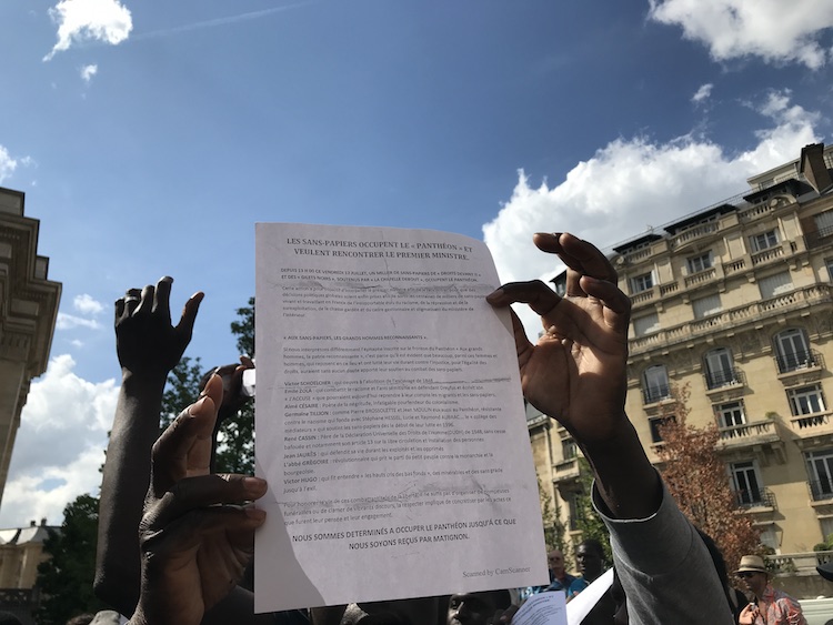 « J’ai envie de me battre pour obtenir mes droits et mes papiers. » Mamadou fait le pied de grue devant le Panthéon. À l’intérieur, plusieurs centaines de sans-papiers, comme lui, occupent le monument du cinquième arrondissement, ce vendredi 12 juillet. Ils se revendiquent Gilets noirs et n’en sont pas à leur première action. Aéroport, siège d’entreprise, bâtiments officiels ou lieu historique, ils y manifestent pour réclamer leur régularisation et leurs droits.
