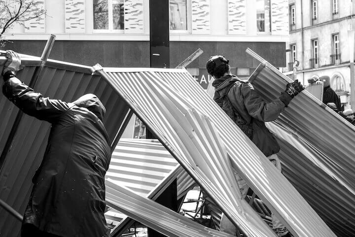 Des manifestants cherchent à retarder l'avancée des forces de l'ordre lors d'une manifestation contre la loi Travail. 31 mars 2016. / Crédits : Yves Monteil