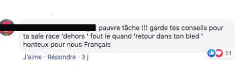 Le reste n’est guère plus reluisant : « Il va falloir un jour arrêter de chialer et nettoyer cette merde » ; « Les Français ne voient pas ou ne veulent pas voir l’islamisation de la France. Désormais les dés sont jetés. A moins que… Mais c’est nous qui avons ce pouvoir dans les mains ». Une femme raconte également que sa voisine « robeu » – comprendre arabe – lui pose problème :