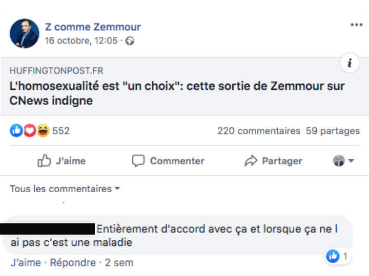 Il s’y exprime aussi toute sorte de discriminations : islamophobie, LGBTphobie, sexisme. Des centaines de commentaires qui tombent sous le coup de la loi : incitation à la haine, appels aux meurtres et à la guerre de religions. Depuis que le polémiste distille quotidiennement sur CNews ses sorties racistes, leur nombre a explosé. Le tout contribue à « un climat de haine et à une normalisation, car Zemmour n’invente rien, il normalise des idées qui existent déjà », détaille Nicolas Lebourg, spécialiste de l’extrême-droite.