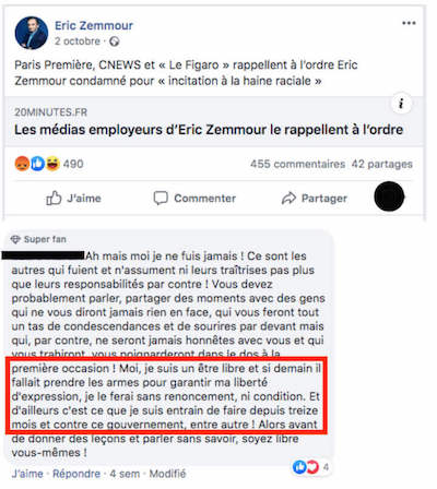 L’interview pour I24 News est également postée sur une autre page de soutien à Eric Zemmour. « Eric Zemmour parle des problèmes avec l’islam en France, du regroupement familial dans les années 70, qu’une guerre est inévitable et qu’elle sera sanglante », écrivent les auteurs de la page. Les fans du polémiste abondent. « Elle est en marche cette guerre identitaire […] Un conflit majeur est latent et dans le même temps un conflit civil identitaire. Et j’ose aller jusqu’à dire que c’est une absolue nécessité ! », débute l’un. « Il ne reste plus que l’armée pour sauver la face », affirme un autre, qui se voit répondre : « Bien d’accord avec vous, il ne faudrait pas tarder ».