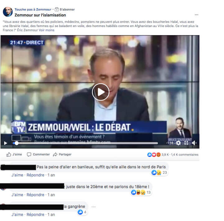 Dès que le polémiste fantasme sur « l'islamisation » de la France, les commentaires haineux affluent. / Crédits : Capture d'écran de Facebook