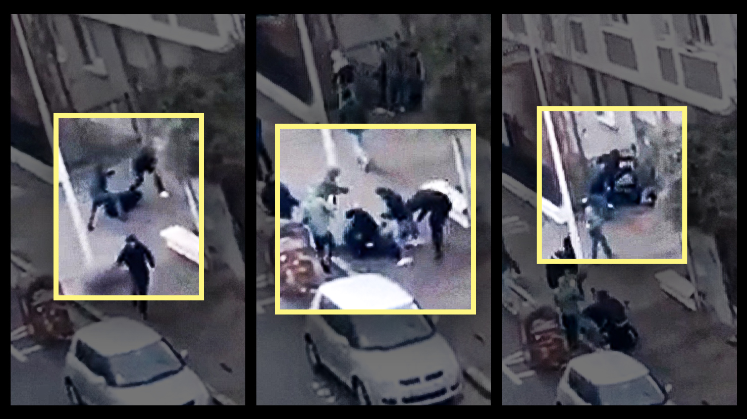 Des images, tournées par un riverain au niveau du 16, rue Victor Lagrange et diffusées par la chaîne de télévision, montrent ce qui semble être la fin de cet affrontement. La séquence est d’une extrême violence. Au bord de la voie, deux hommes à terre sont violemment tabassés par cinq individus. À quelques mètres derrière, un autre est frappé par au moins trois autres personnes. Deux des hommes au sol parviennent finalement à s’échapper. Le troisième reste sur le bitume, immobile, tandis que la douzaine de personnes qui a participé à ce passage à tabac s’éloigne.