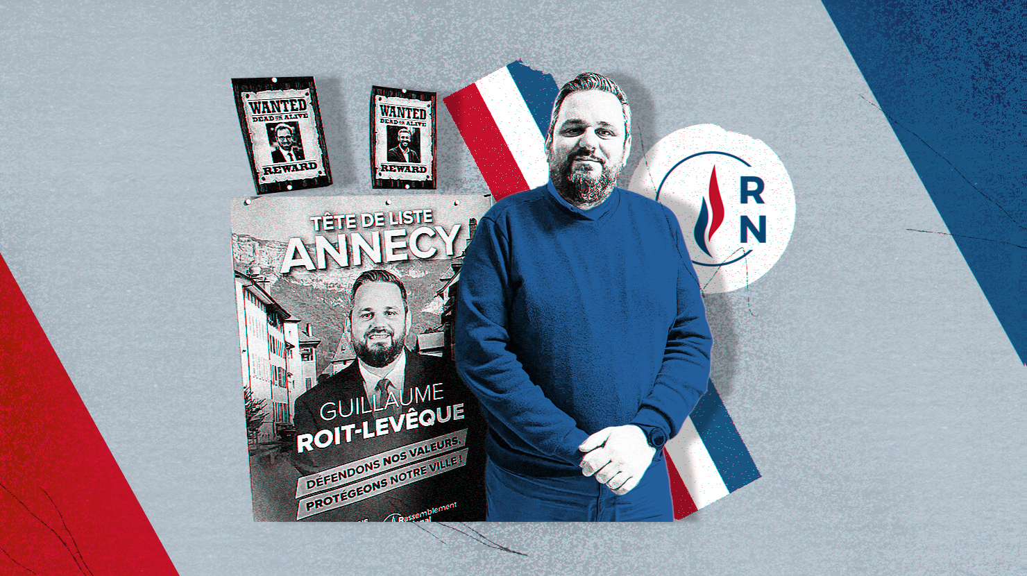 « Nous ne faisons pas campagne contre quelqu’un mais pour notre ville », clame Guillaume Roit-Levêque sur son site de campagne. Pourtant, le candidat tête de liste du Rassemblement national (RN) à Annecy (74), qui est aussi délégué départemental du parti, n’hésite pas à poser devant des portraits de ses rivaux à attraper « morts ou vifs », lorsqu’il est interviewé par la radio France Culture, jeudi 26 février.