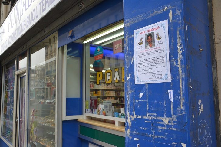 Rue Louis Blanc – Paris 10e. C’est une des traditions de « Little Jaffna », le quartier tamoul de Paris qui s’étend au sud du métro La Chapelle. Sur les façades des supermarchés exotiques, des taxiphones, des pâtissiers et même parfois sur les portes d’entrée des immeubles : des feuillets, pas plus grand qu’un format A4, avec des visages en photo. Quelques lignes en caractères tamouls complètent ces affichettes, souvent décorées par des symboles religieux ou des dessins de fleurs. Ce sont des avis de décès.